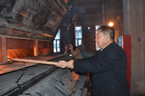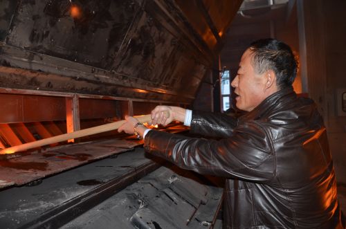 (城發(fā)公司副總經(jīng)理梁永慶,手持火把密切關(guān)注爐膛內(nèi)火焰燃燒的態(tài)勢(shì)。李波攝)