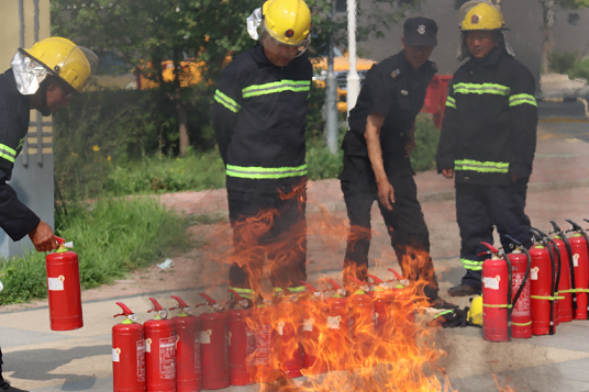 項目處經理李銳詳細介紹了四公斤手提干粉滅火器的使用方法和注意事項。隨著第一著火點煙感報警器的預警聲,各組人員統一指揮,高效協調,臨危不亂,在實戰(zhàn)中鍛煉了火場組織疏散程序以及火場逃生、自救互救、搶險滅火的能力。