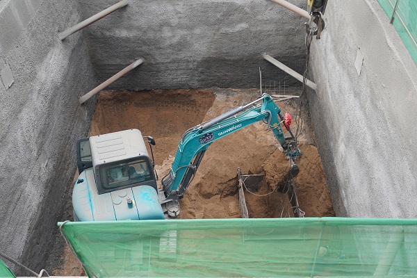 9月24日上午,筆者遠(yuǎn)遠(yuǎn)看到一吊車正將坑內(nèi)挖掘的土方吊起,走近作業(yè)坑,看到坑內(nèi)小型挖掘機正在開挖土方,還有2名施工人員正在進行鋼筋網(wǎng)片的焊接。