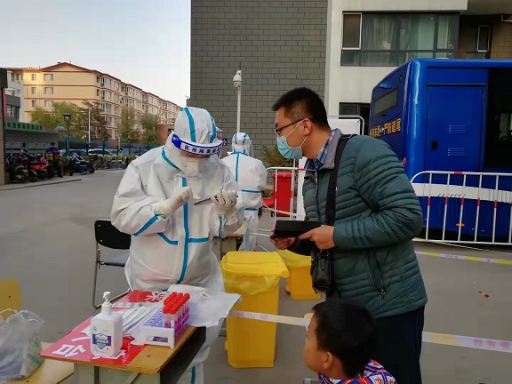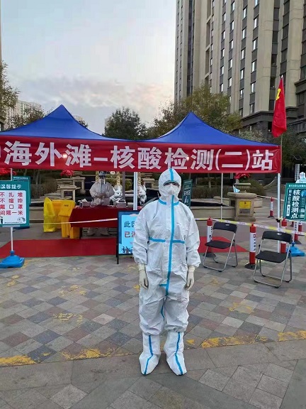 集團(tuán)宣傳部翟玉卿參加金漢御園小區(qū)核酸檢測志愿服務(wù)。