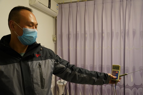 在20號樓3單元6樓的住戶家中,劉婷用手摸了摸用戶家的地板磚,通過人體的直觀感受,發(fā)現(xiàn)用戶家地暖存在散熱不均勻的現(xiàn)象。客服管家用專業(yè)的測溫儀和熱成像儀,進行了測溫。經(jīng)檢測,該用戶家各房間平均溫度均在23℃以上。用戶說,家中較冷的房間是廚房,客服管家又針對廚房進行了測溫,發(fā)現(xiàn)室溫要比其他房間溫度低一些,但熱成像儀測得的結(jié)果與其他房間一致。經(jīng)過觀察與分析,發(fā)現(xiàn)用戶家廚房與陽臺間的隔斷是一扇落地大玻璃門,保溫效果較差,導致廚房溫度低于其他房間。聽了工作人員的講解,用戶也表示了認可,對我們的排查結(jié)果及服務(wù)態(tài)度表示滿意。