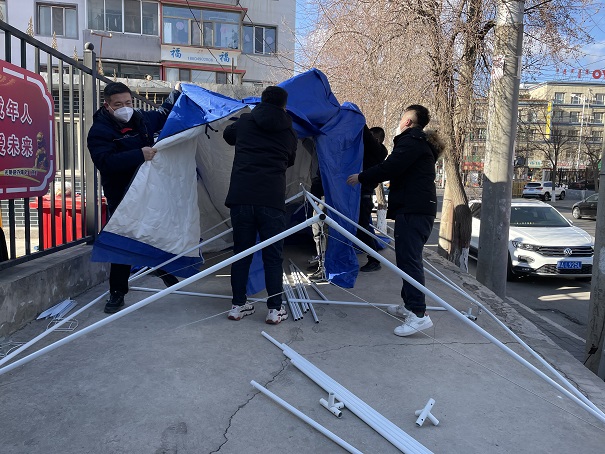 連日來,公司的近百名員工陸續(xù)被派往社區(qū)一線支援疫情防控工作,事務(wù)管理中心安排專人和他們保持聯(lián)系,及時把一次性醫(yī)用外科口罩、N95口罩、防護(hù)服、防護(hù)手套、隔離面罩等疫情防控物資送到各個值守點(diǎn)。2月28日,事務(wù)管理中心主任胡夢園、黨支部書記劉紅梅在電子路社區(qū)值守點(diǎn)查看時,發(fā)現(xiàn)當(dāng)班的員工在寒風(fēng)中堅守著,及時為他們搭建了帳篷,送來了電暖氣。