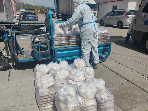 還未喘息,園區(qū)又接到供電部門通知,惱包園區(qū)高壓干線因故障維修,于21日下午14:00-18:00停電,為保障封控人員正常就餐需求,園區(qū)緊急調(diào)配移動柴油發(fā)電機(jī)為園區(qū)餐廳提供電力保障,園區(qū)后勤保障組工作人員順利完成當(dāng)日各封控區(qū)域集中隔離人員當(dāng)日三餐共2265份的配送工作。