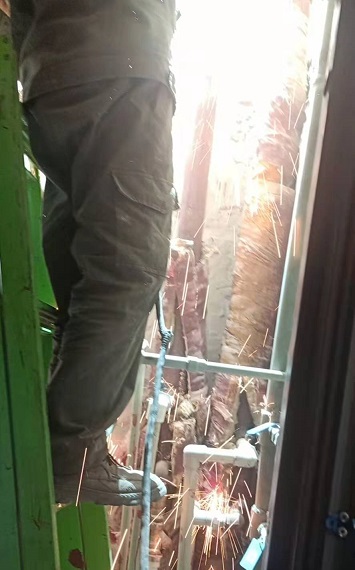 5月17日,筆者來(lái)到開(kāi)天花園小區(qū)的供熱二次管網(wǎng)改造施工現(xiàn)場(chǎng)。在高層單元樓的管道井里,工人正在狹窄的空間里作業(yè),將單元樓道內(nèi)的立管進(jìn)行切割拆除。在施工材料現(xiàn)場(chǎng),西北角堆滿了拆除下來(lái)的地溝管,部分管道腐蝕嚴(yán)重,布滿了密密麻麻的窟窿眼兒;東北角堆放了新到的管材,工人們正在進(jìn)行單元立管外表的打磨工作,打磨完成后再進(jìn)行粉刷兩遍防腐漆。
