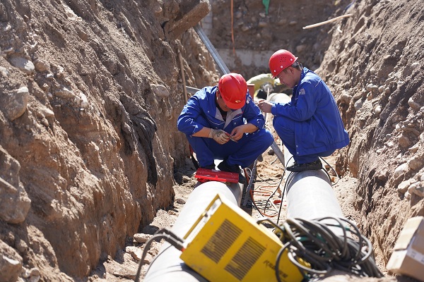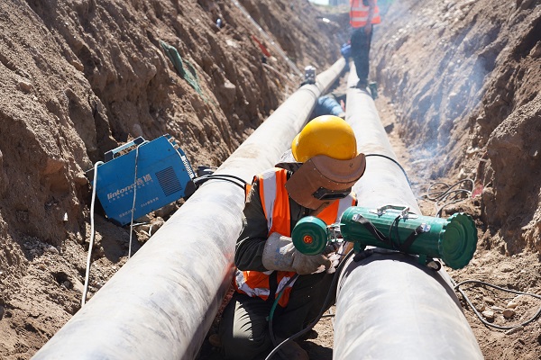 一個工人師傅,側(cè)身躺在兩個管道中間的狹小夾縫中,對管道進行焊接。施工單位天津管道公司的段步雨向筆者介紹,"現(xiàn)在這個師傅做的是第二道工序,叫電焊造面。你看到這么長的管子,都是一截一截焊接起來的,焊接要兩道工序,第一道是氬弧焊打底,就是在電弧焊的周圍通上保護氣體----氬氣,使焊材不能和空氣中的氧氣接觸,從而防止了焊材的氧化,所以第一遍要用氬弧焊,就是為了焊口不生銹,確保它的使用年限。氬弧焊完成后,為了管道外壁齊平,焊口更牢靠,再進行第二遍電焊造面。"