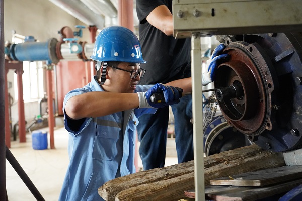近日,筆者跟隨城發(fā)供熱公司橋靠分公司運(yùn)營(yíng)六所所長(zhǎng),來(lái)到了巨海城二區(qū)的加壓站,那里正在對(duì)站內(nèi)的設(shè)備進(jìn)行檢修。筆者一進(jìn)加壓站,就看到五個(gè)身強(qiáng)體壯的男同志正在合力拆卸一個(gè)1米多高的循環(huán)泵,他們有的拉著鋼絲繩,有的往下面墊木板,每個(gè)人的手臂上是青筋暴起,臉憋的通紅。別看這么不起眼的一個(gè)循環(huán)泵,5個(gè)人用了半小時(shí)才拆卸下來(lái)。
