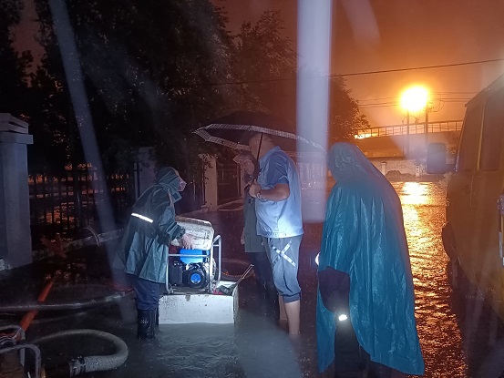 橋靠分公司組織員工們先將防汛沙袋置于地勢較低的單元門口,將水泵置于地勢最低處做好了防汛排水的準(zhǔn)備工作。為了確保人民群眾的生命財產(chǎn)安全,在做好前期準(zhǔn)備工作后,大家便守在現(xiàn)場,密切關(guān)注天氣情況,實(shí)時監(jiān)測雨情汛情,雖然白天的天空還能看到藍(lán)天白云,但他們堅守崗位絲毫不敢松懈,只是買了盒飯靠在車旁簡單的解決了溫飽。13日夜間22時,隨著雨量的加大及降雨的持續(xù),小區(qū)內(nèi)地勢低洼處排水量開始小于降水量,積水深度開始上漲。此時天空就像是開啟了“水簾洞”模式,穿著雨衣依舊全身濕透的防汛職工們冒著雨淌著水一遍遍的查看,按照防汛作業(yè)預(yù)案開展工作,他們始終堅守一線在暴雨中逆行,全力以赴守護(hù)轄區(qū)群眾安危。