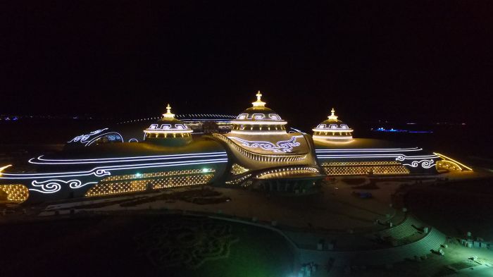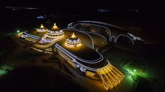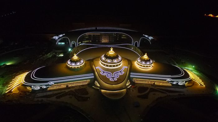 截止到2017年4月30日,內(nèi)蒙古少數(shù)民族群眾文化體育運(yùn)動(dòng)中心項(xiàng)目完成投資共7.67億,目前各建筑物主體已完成,亮化工程完成80%,燈光效果初具模型。