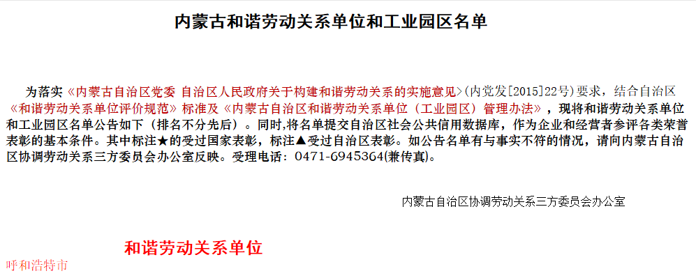 內蒙古自治區(qū)和諧勞動關系單位的光榮稱號。