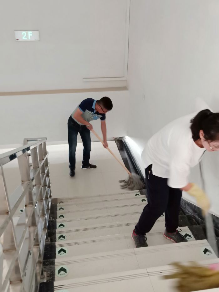 主站樓部分是攻堅之戰(zhàn),30位員工在透明的頂棚下感受悶熱灼曬、揮汗如雨,每一塊地磚都是經(jīng)過了水沖、塵推、除塵、清洗、抹凈、擦干等六道工序,方可達標(biāo)。上下兩層共26912平方米,經(jīng)過兩天半的時間終于完工,看著光亮如新、纖塵不染的候車廳,所有員工的臉上都綻放了發(fā)自內(nèi)心的微笑。