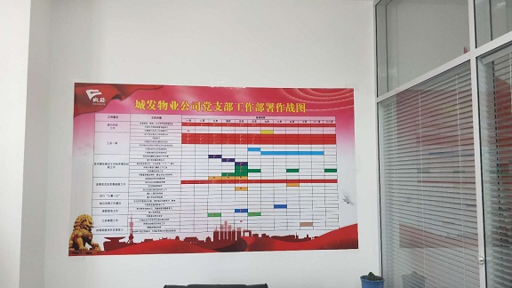 6月1日,城發(fā)物業(yè)公司黨支部辦公室、黨群工作處的兩張黨建工作部署作戰(zhàn)圖展板,吸引了全體干部職工的注意力。這兩張展板不僅詳細地安排部署了今年黨建的各項重點工作和日常工作,同時按照時間節(jié)點,細化操作舉措,掛圖作戰(zhàn),序時推進,精準發(fā)力,穩(wěn)扎穩(wěn)打,逐步推進基層黨組織建設(shè)工作水平。