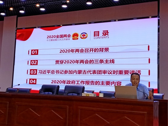 孫忠輝副教授以2020年全國兩會精神為專題,分別對2020年兩會召開的背景、貫穿2020年兩會的三條主線、習近平總書記參加內(nèi)蒙古代表團審議時重要講話、2020年政府工作報告的主要內(nèi)容做了深入的解讀與細致的講解。兩會號召全國各族人民要更加緊密地團結(jié)在以習近平同志為核心的黨中央周圍,高舉中國特色社會主義偉大旗幟,以習近平新時代中國特色社會主義思想為指導(dǎo),全面貫徹黨的十九大和十九屆二中、三中、四中全會精神,堅決貫徹黨的基本理論、基本路線、基本方略,增強“四個意識”、堅定“四個自信”、做到“兩個維護”,緊扣全面建成小康社會目標任務(wù),統(tǒng)籌推進疫情防控和經(jīng)濟社會發(fā)展工作,在疫情防控常態(tài)化前提下,堅持穩(wěn)中求進工作總基調(diào),堅持新發(fā)展理念,堅持以供給側(cè)結(jié)構(gòu)性改革為主線,堅持以改革開放為動力推動高質(zhì)量發(fā)展,堅決打好三大攻堅戰(zhàn),加大“六穩(wěn)”工作力度,全面落實“六保”任務(wù),堅定實施擴大內(nèi)需戰(zhàn)略,維護經(jīng)濟發(fā)展和社會穩(wěn)定大局,同心協(xié)力,攻堅克難,銳意進取,確保完成決戰(zhàn)決勝脫貧攻堅目標任務(wù),全面建成小康社會。同時闡明了中華民族向來不畏艱難險阻、當代中國人民有戰(zhàn)勝任何挑戰(zhàn)的堅定意志和能力。