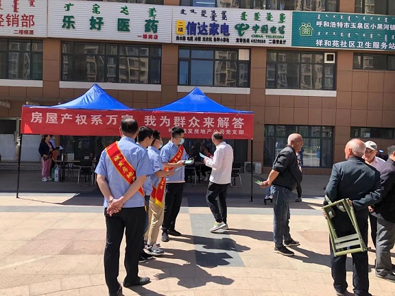 在祥和苑公租房小區(qū)社區(qū)服務(wù)中心,志愿者們向廣大群眾詳細(xì)的介紹了公租房購買條件和流程,以及辦理不動產(chǎn)權(quán)證等政策知識,并為購房群眾現(xiàn)場發(fā)放了辦理不動產(chǎn)權(quán)證的發(fā)票和網(wǎng)簽合同。同時大家還主動前往小區(qū)人流較多的北門,熱情的向廣大群眾發(fā)放了公司專門制作的公租房銷售和不動產(chǎn)權(quán)證宣傳圖冊,耐心的為群眾解答購買公租房和辦理產(chǎn)權(quán)政策的各項(xiàng)疑慮、困惑。