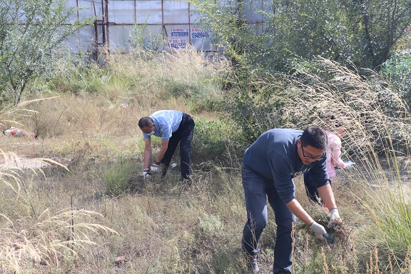 活動中,大家在張永同志的帶領(lǐng)下進行地毯式清除,大家戴手套、口罩、全副武裝,采取連根拔出和收割的方式徹底消除蒿粉傳播漂浮,切斷蒿粉過敏原并將拔出的蒿草及時清運,以免草籽散落再次生長。